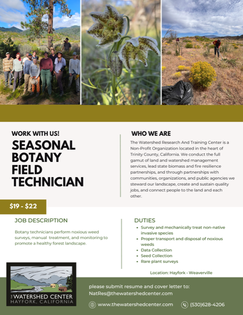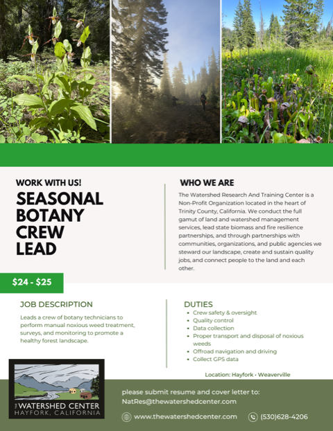 State Parks botany crew hires: State Park's North Coast Redwoods District is hiring two botany technicians for the next botany season, starting on April 1st 2026. We have many acres of botanical surveys to do in 2026, mainly in Del Norte Coast Redwoods State Park for the Redwoods Rising forest restoration collaborative and in Humboldt Redwoods State Park as part of the watershed restoration. Can you think of any Botany or Ecology recent graduates, majors soon to graduate, or grad students who would be interested in and capable of doing rare plant surveys for State Parks? These are comprehensive floristic surveys that also include revisiting existing rare plant occurrences and mapping sensitive communities. We need techs who have knowledge of the local flora, can use the Jepson manual and other plant keys, are willing to work independently and don't mind working in increment weather or steep terrain. The reporting location for these positions will be Fort Humboldt SHP in Eureka. This is a seasonal full time position (typically four 10-hour days per week) starting on April 1st with field work through August and data entry and QA/ QC into September. If the applicant is interested in report writing and has GIS and writing skills, year round employment (up to 1890 hours/ year) is possible. Other than conducting botanical surveys, tasks include monitoring vegetation for restoration projects, collecting seed/ plant material and assisting the District nursery technician in multiple restoration projects.