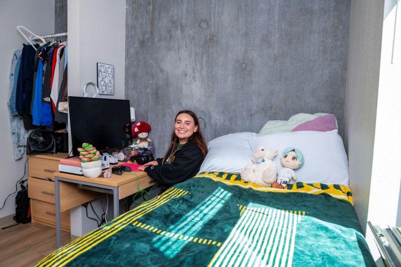 - Each room includes a closet, bed, dresser, and desk for each resident.